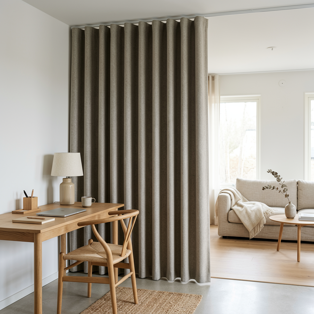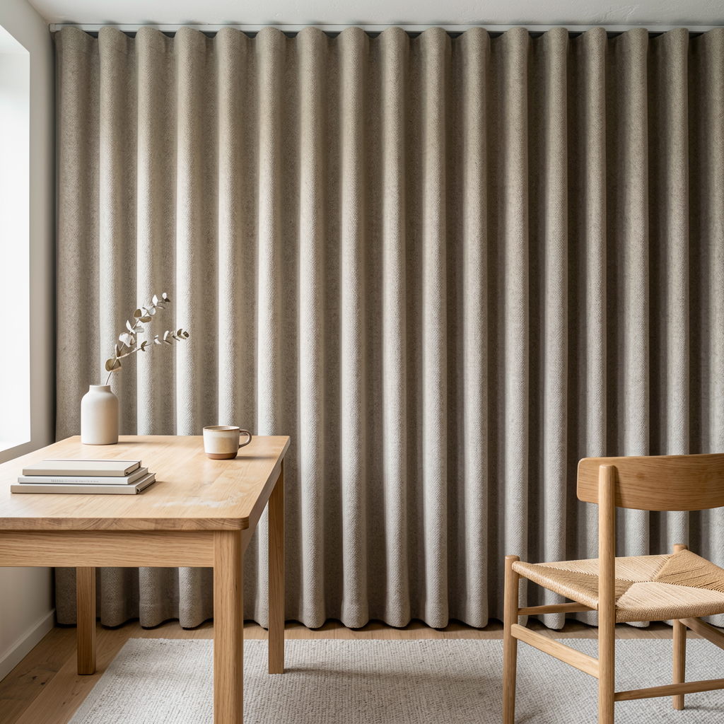 Akustikvorhänge eignen sich für Büros, Home Offices, Wohnräume, Studios oder überall dort, wo Hall reduziert oder Bereiche akustisch getrennt werden sollen.
